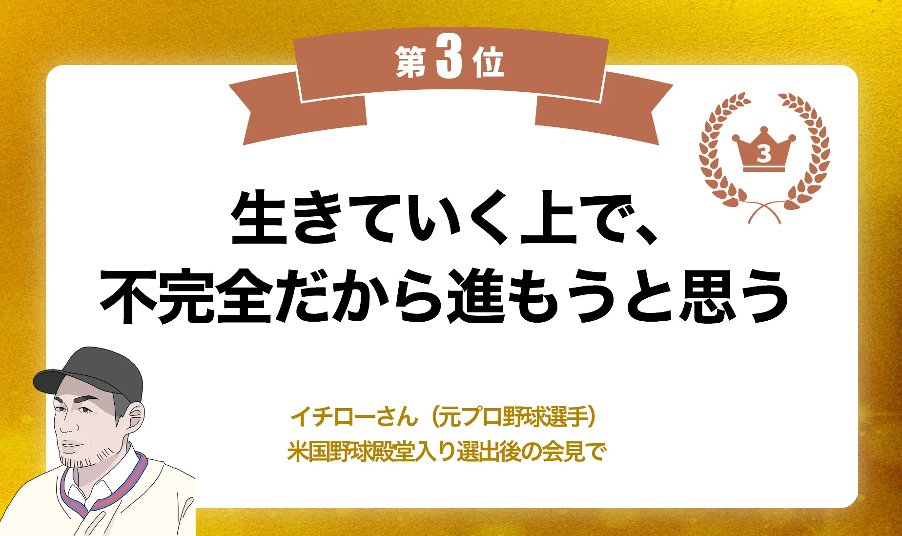 殿堂入りは投票で決まる仕組みだが、満票に1票だけ足りなかった。そのことをイチローさんは、こう評価した。人は「もう完全だ」と思った時点で歩みを止めてしまうもの。逆に「まだ完全じゃない」と意識することが、推進力を生む。ポテンシャルを信じ続ける姿勢を通して、限界を拡げてくれるコトバ。