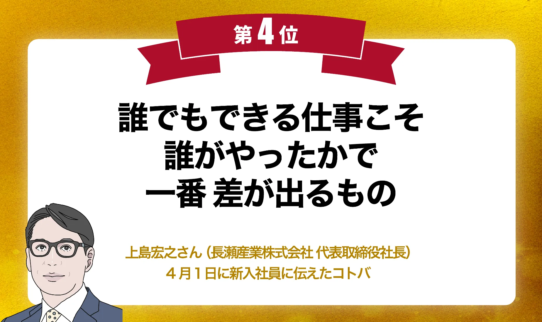 上島社長が新入社員に贈った成長の秘訣は「突き詰める」こと。最初は「誰でもできる仕事」でも、突き詰めれば「あなたにしかできない仕事」になり、それができる人のもとに、新しいチャンスが訪れる。自分の仕事の意味や生きがいに悩んだ時にこそ思い出したい、気持ちを奮い立たせてくれる名言。
