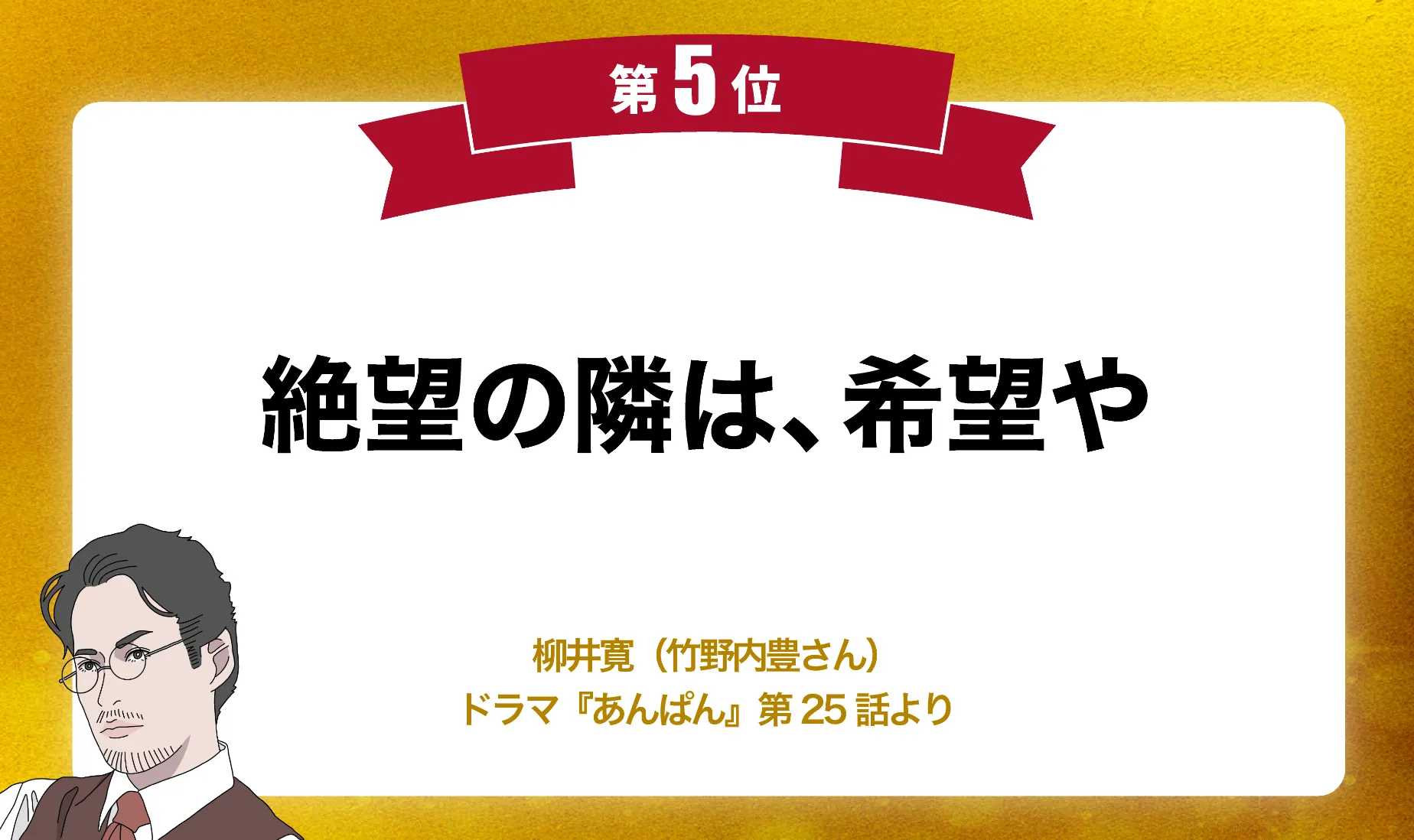 主人公のモデル・やなせたかしさんご本人のコトバをもとにしたセリフ。やなせさんは東日本大震災の年に『絶望の隣は希望です!』というタイトルの本を出版。災害に限らず、人生のさまざまな場面で、絶望のふちに立たされた人々に希望を与えてくれるコトバ。