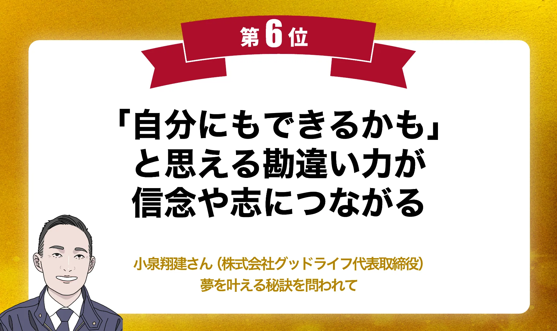 会社を引き継いだときは約1億円の債務超過でどん底のスタートだったが、今ではそれを解消し、成長を続けているという小泉社長。原動力は「あの憧れの人のようになれるかも」という「勘違い力」だったという。ポジティブな自己暗示には、未来を変えるチカラがあることを教えてくれる名言。