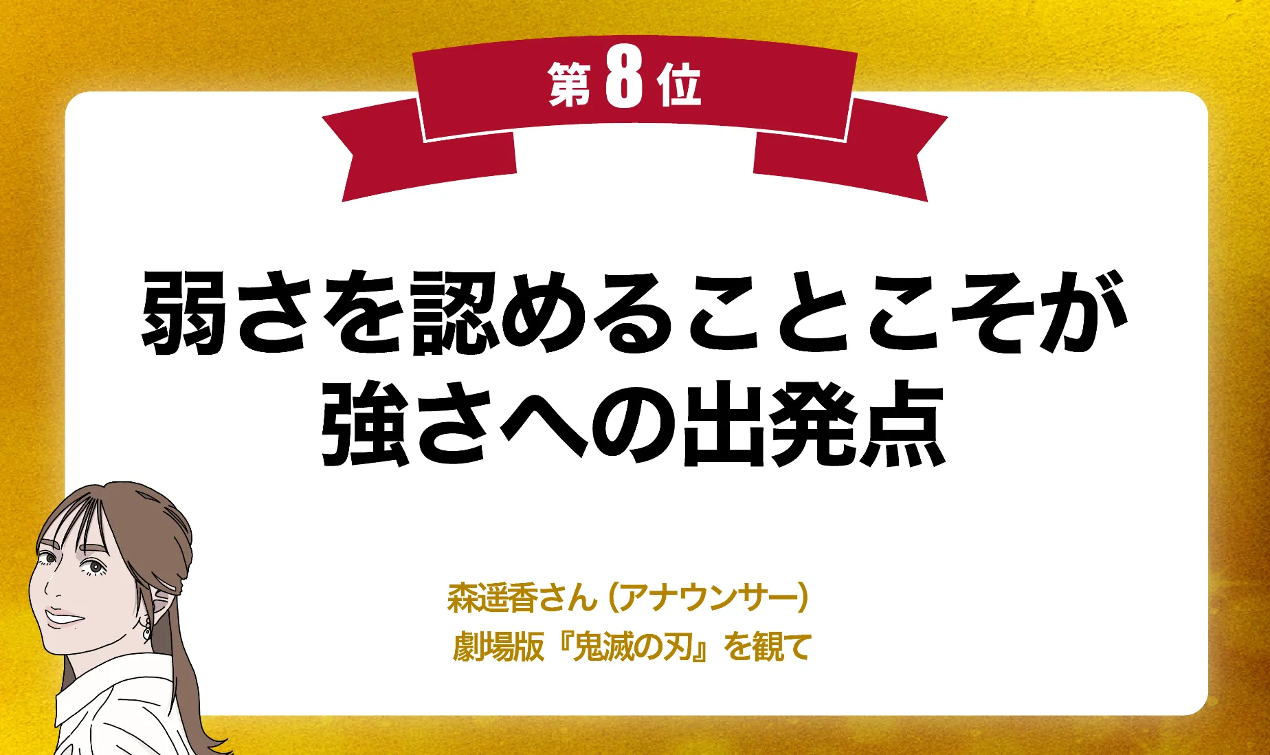 『鬼滅の刃』を観るたび「強さとは何か」を考えさせられるという森さん。強さは生まれつきではなく、弱さを認める勇気から育つことを、登場人物たちから学んだそう。「もっと強くなりたい」と一歩を踏み出そうとする、すべての人の背中を押す一言。
