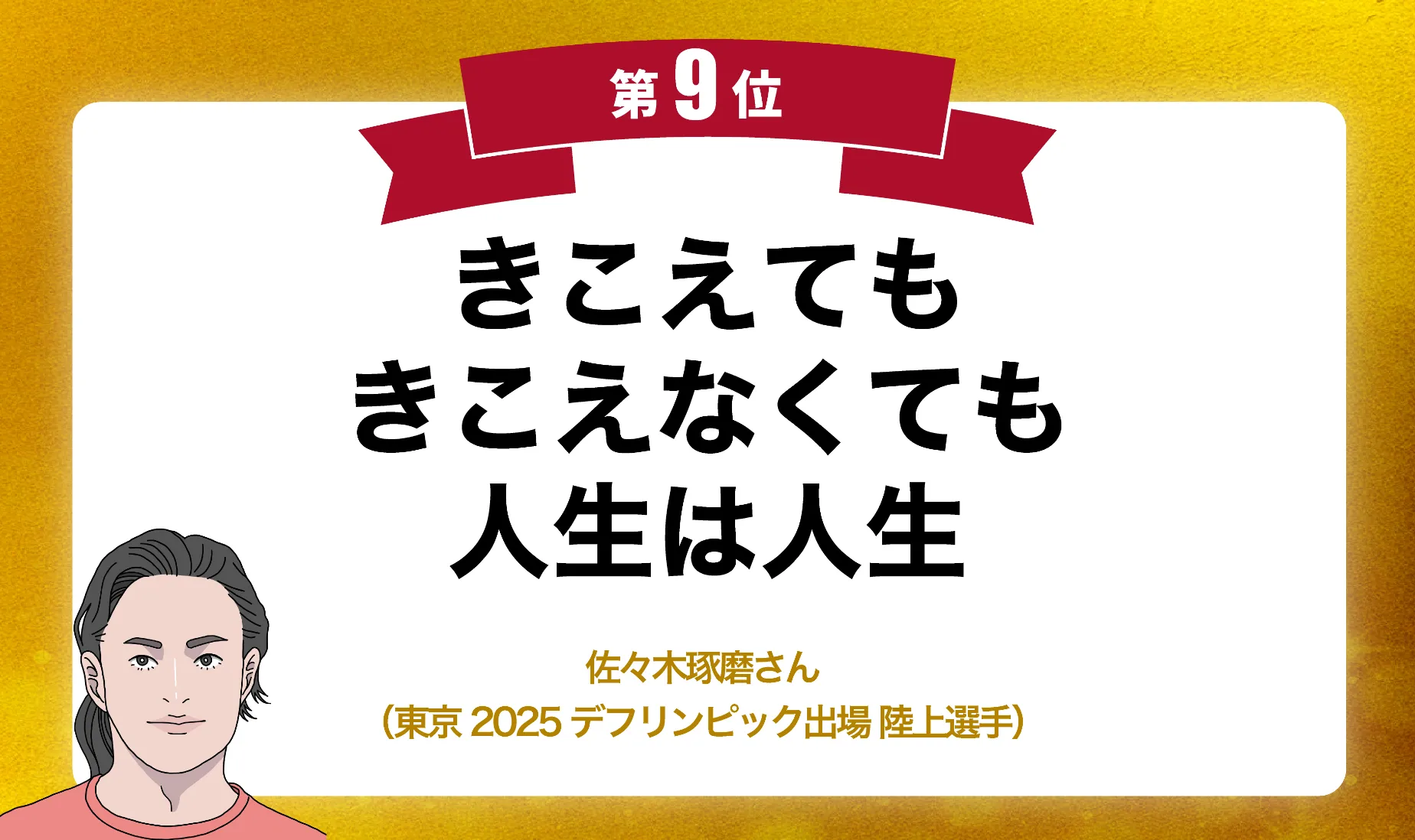 もともとは野球少年だった佐々木選手。のちに代表選手にまで上りつめることとなったデフ陸上に出会ったのは、健聴者との会話に限界を感じて野球をやめ、将来が見えなくなったときだった。人生の価値は、他者と比較できるものではなく、どんな人生にも、その人なりの物語がある。そんな誇り高さを感じさせるコトバ。