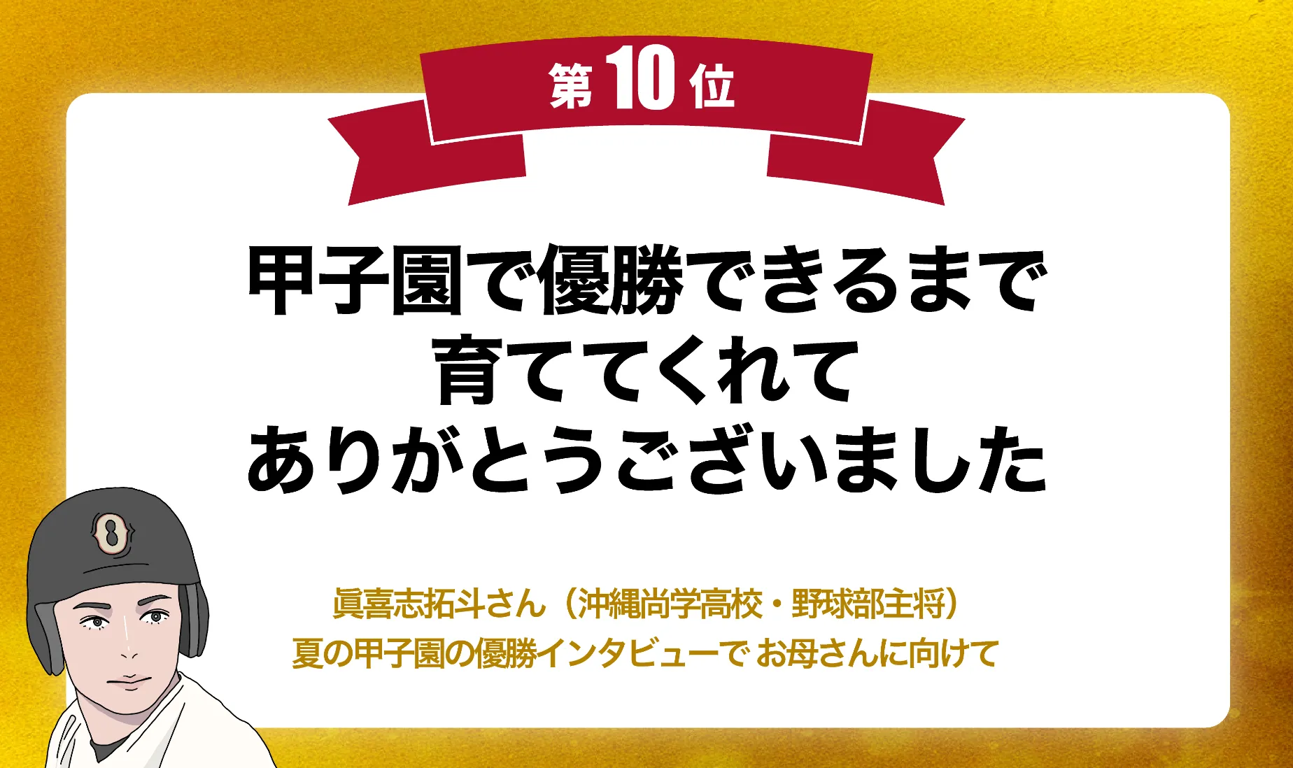 甲子園で優勝した日は、ちょうどお母さんの誕生日だった。優勝インタビューを聞きながら、顔を覆って泣くお母さんの姿が中継に映ると、球場全体が、あたたかい拍手につつまれた。親子間で、あえて敬語で伝えた点も、球児の巣立ちを思わせるドラマ性が感じられる。心がじんとする名言。