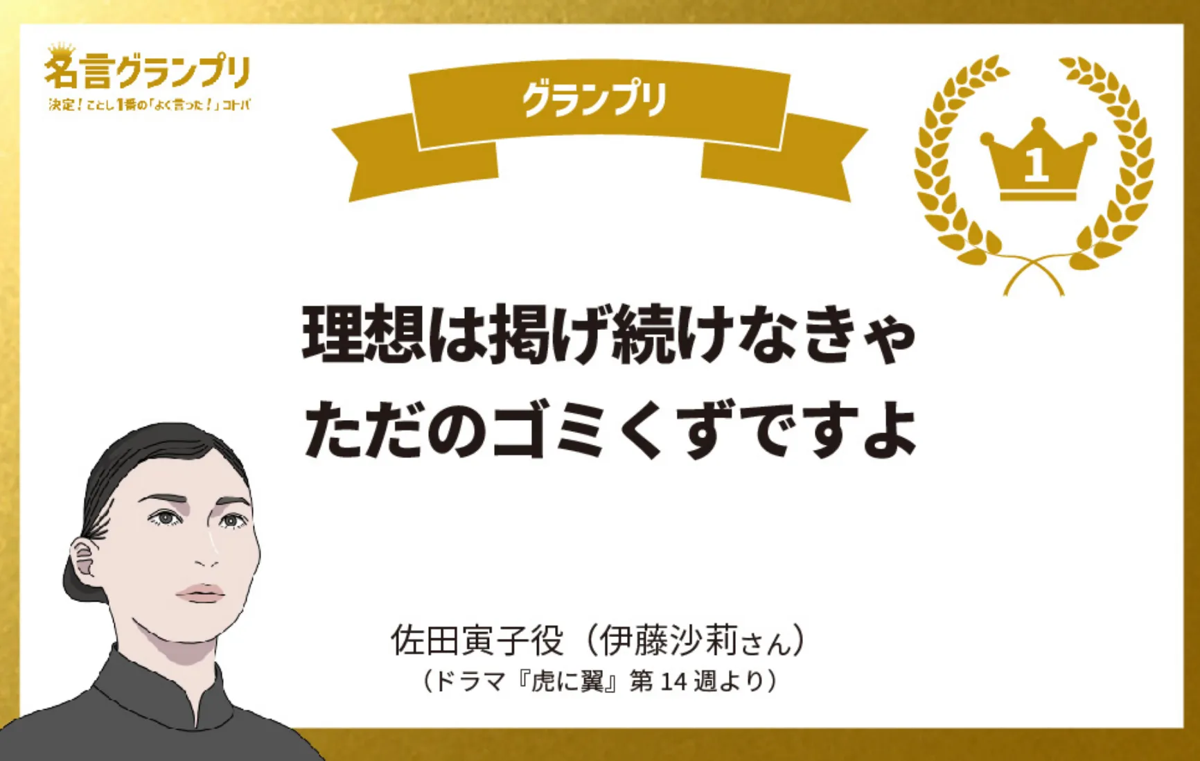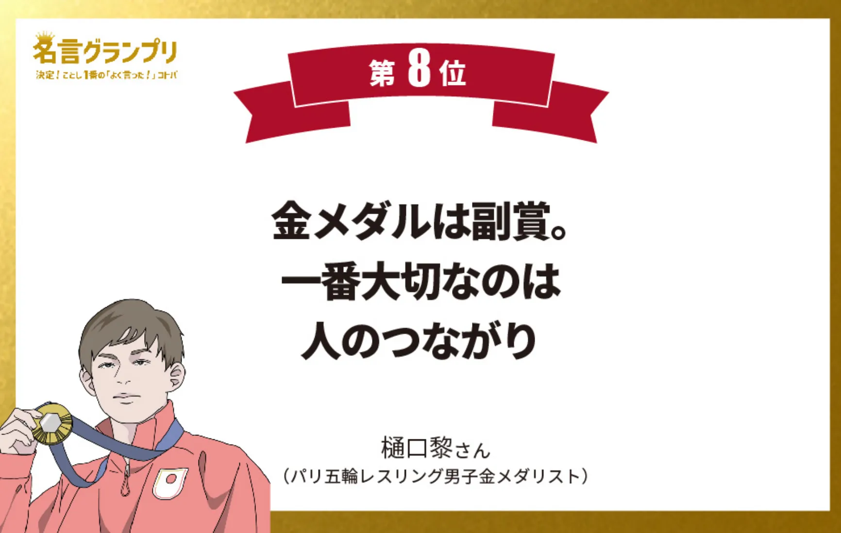 パリ五輪で金メダルを手に入れた樋口選手が日本に帰還したあと、地元で結果報告した際に述べたコトバ。世界一になっても独りよがりになることなく、開口一番、周りへの感謝を口にする姿勢が賞賛を浴びた。
